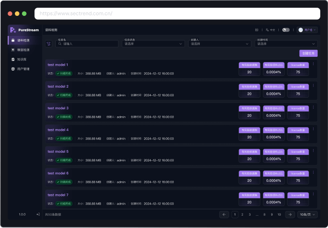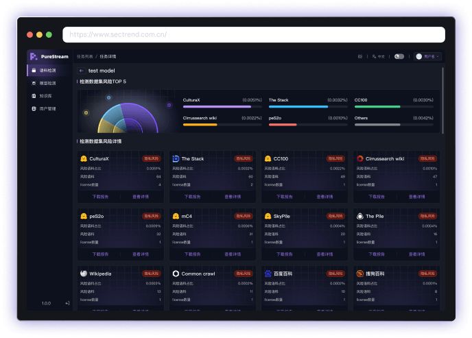 支持清晰追溯数据集来源及构成,防范法律风险;展示数据集名称、风险占比等详细风险指标,并提供包含关键本地模型与匹配模型信息的精准模型溯源功能