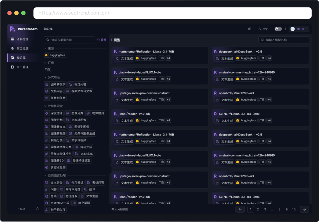 支持按模型来源及类型检索,为开发人员、研究人员及部署团队提供模型详细特征、性能数据与使用指南;展示模型名称、类型、架构、训练数据集等关键数据